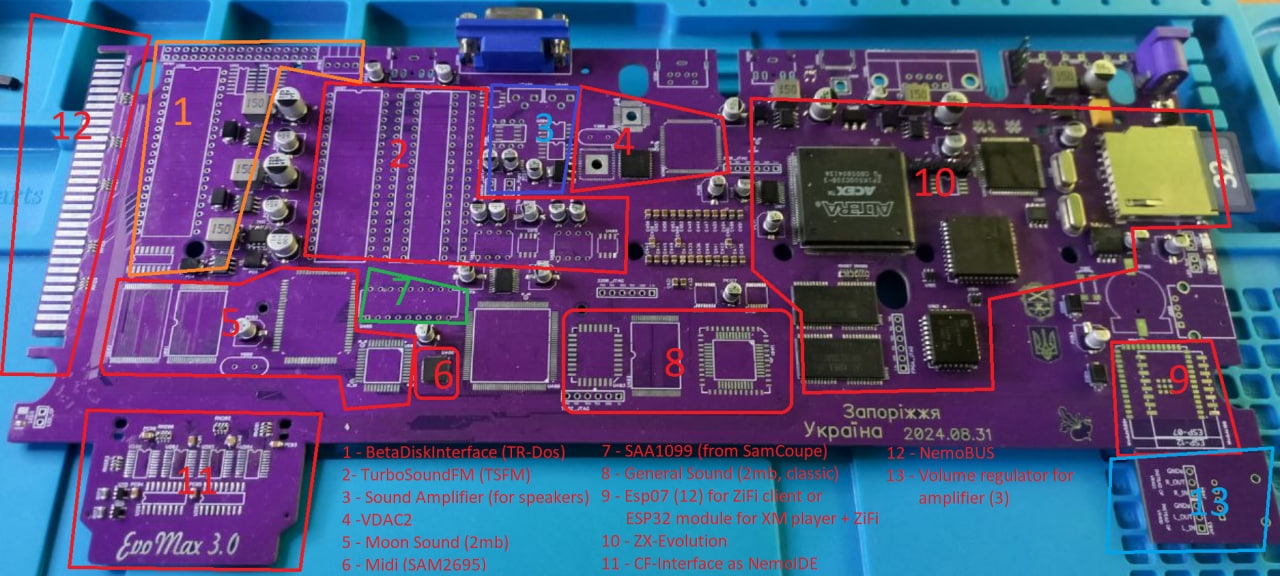 Tam, kde ZXEVO.1010 vsází na rozumnou kompaktnost, jde ZX Evo Max opačným směrem: jde o nejkomplexněji osazenou Pentevo desku, jaká kdy vznikla. Filozofie je prostá – žádné rozšiřující moduly, žádné externí karty. Vše na jedné desce, v malém přenosném pouzdru.