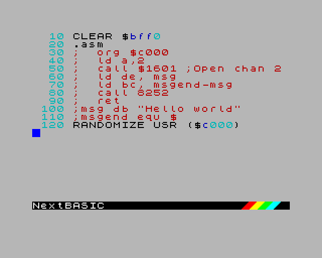 Princip je elegantně jednoduchý. Do svého NextBASIC programu napíšete .asm — tím spustíte assembler. Ten pak prochází následující řádky programu a hledá ty, které začínají středníkem ;. Obsah za středníkem bere jako assemblerový zdrojový kód a kompiluje ho do paměti. Jakmile narazí na řádek bez středníku, zastaví se a vrátí kontrolu BASICu.