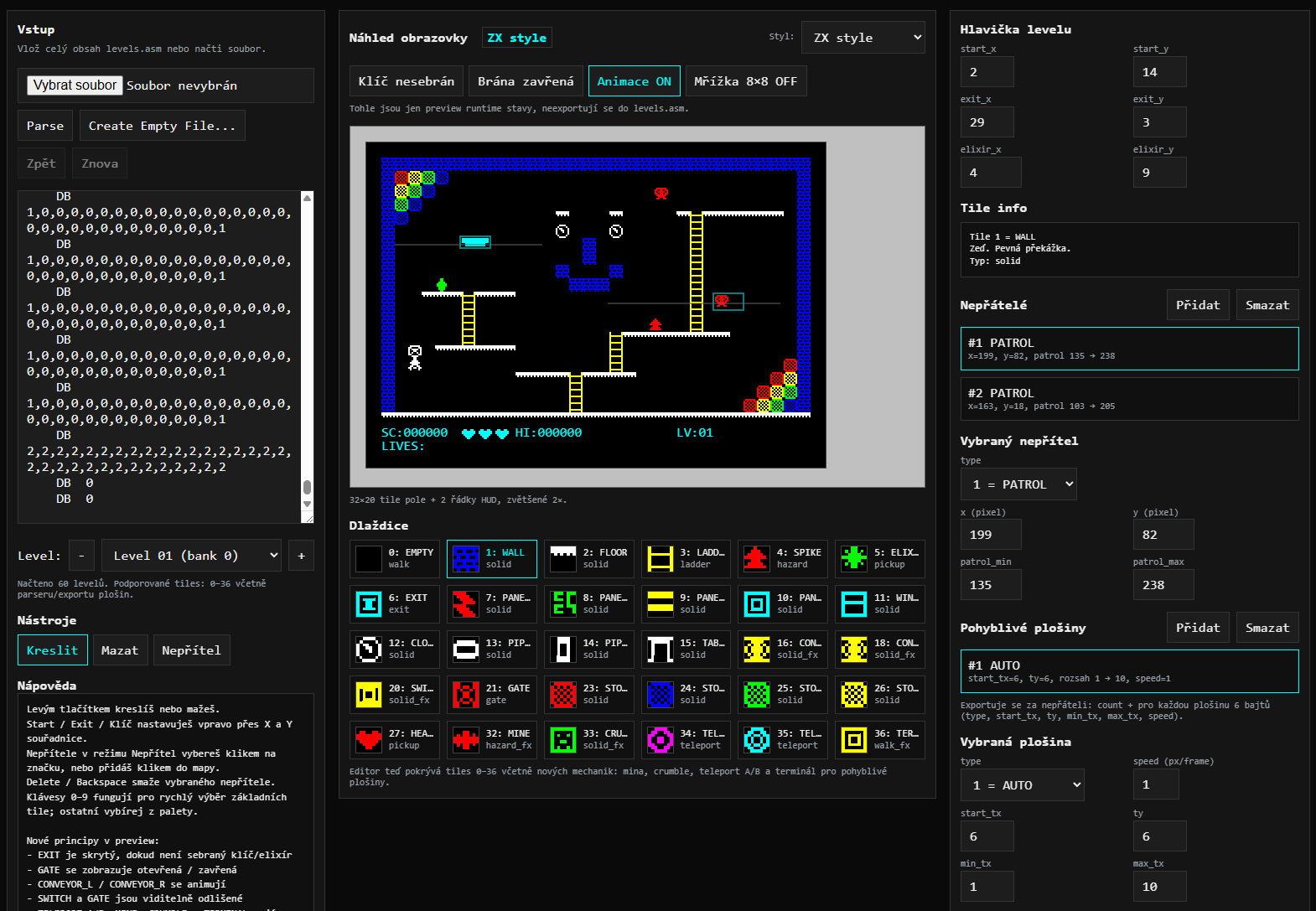 Na konci všeho práce je export zpět do assembleru. Jde exportovat buď jen aktuální level, nebo celý soubor levels.asm. Struktura dat se zachovává přesně tak, jak ji hra očekává.