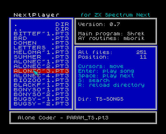 NextPlayer je přehrávač souborů AY hudby pro ZX Spectrum Next. Umí přehrávat formáty PT2, PT3, STC, STP a SQT - tedy hudbu, kterou všichni milujeme. Přehrávač nabízí procházení adresářů na SD kartě, vyhledávání a zobrazení názvů souborů včetně dlouhých LFN jmen.